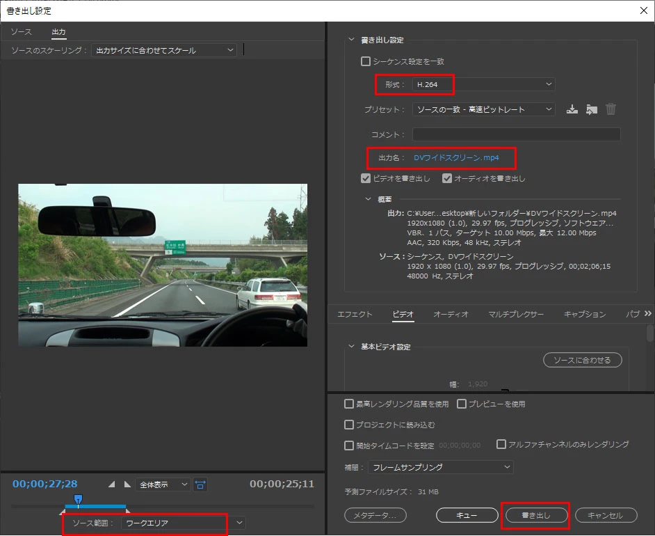 ②書き出し設定は、形式は「H.264」を選択し、出力名は青色の文字の上をクリックして書き出すフォルダー名やファイル名を指定します。また下端左側のソース範囲は「ワークエリア」を選択します。他は初期設定のままとします。