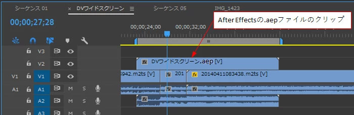 ④After Effectsで保存した.aepファイルをPremiere Pro CCの「プロジェクト」パネルに読み込み、さらに「プロジェクト」パネルからビデオトラックに配置し、編集を行います。