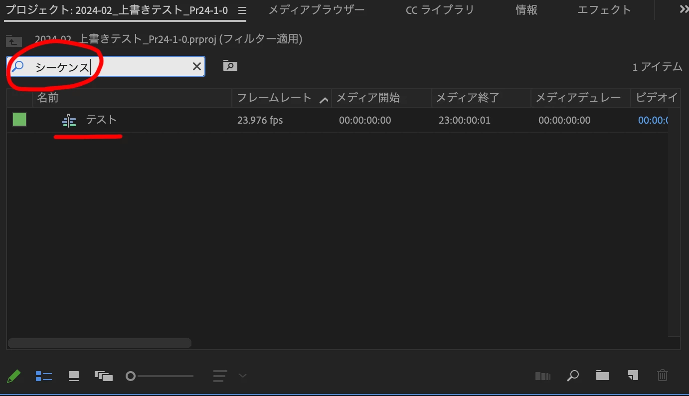 (プロジェクトパネル内のシーケンスを「削除」してしまった場合には、その直後であれば「取り消し」で戻せるのですが、プロジェクトを上書き保存してPremiere Proを閉じたりしていますと「取り消し」では戻れず、自動保存を探すことになるかと思います。)