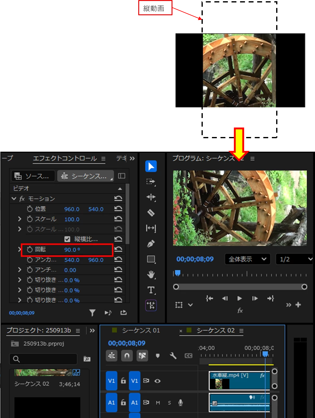 プレミアプロで横動画を作成したいのですが、素材によっては縦動画になっているものがあります。90°回転?などの方法はあったりしますか?