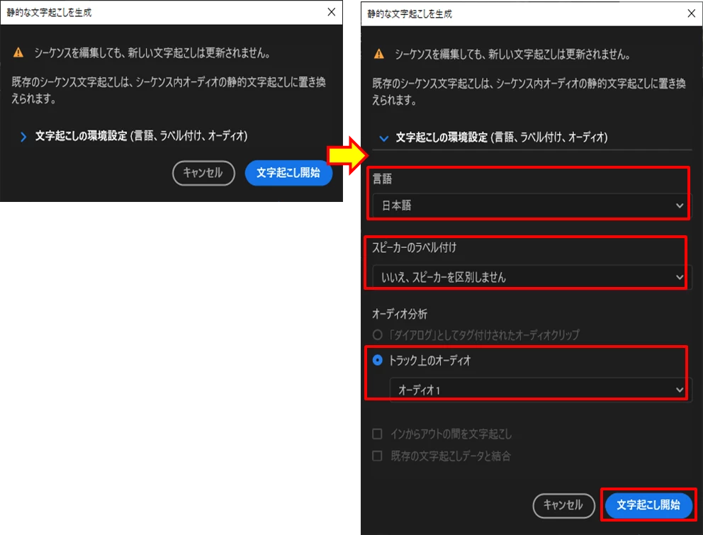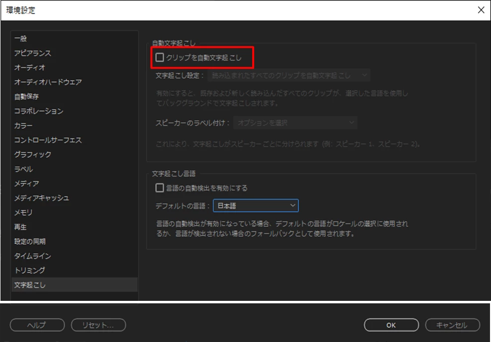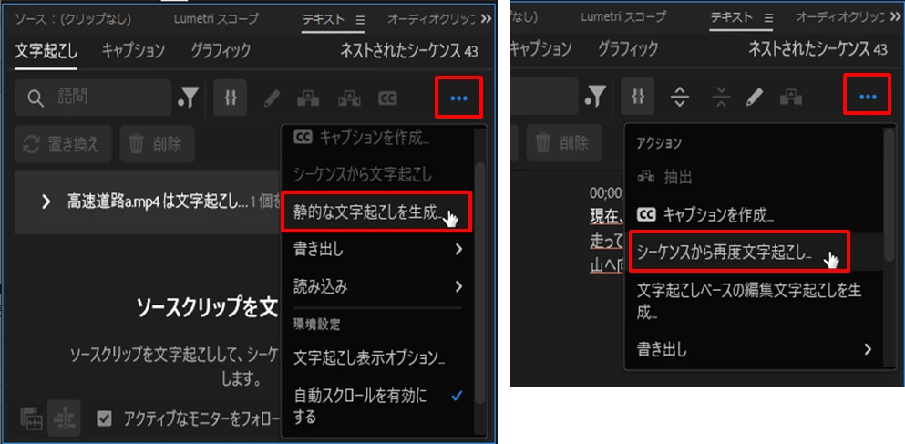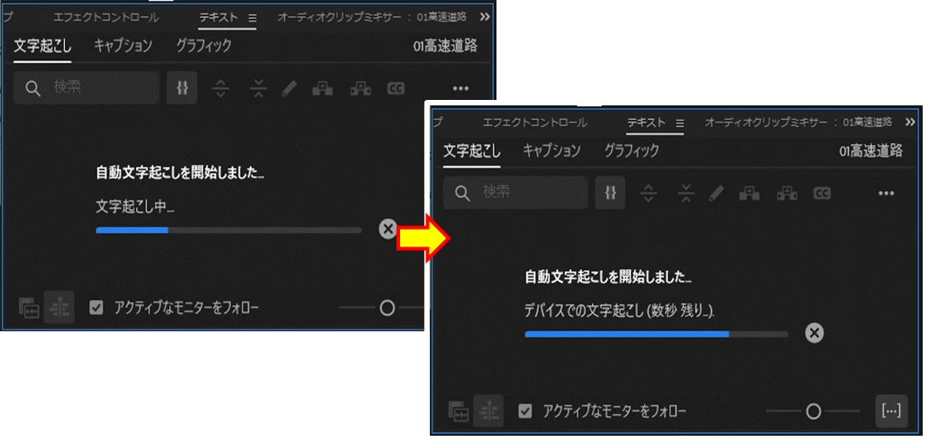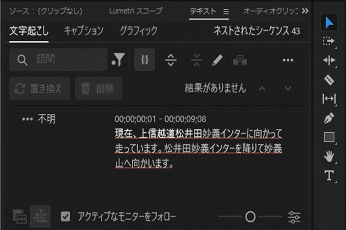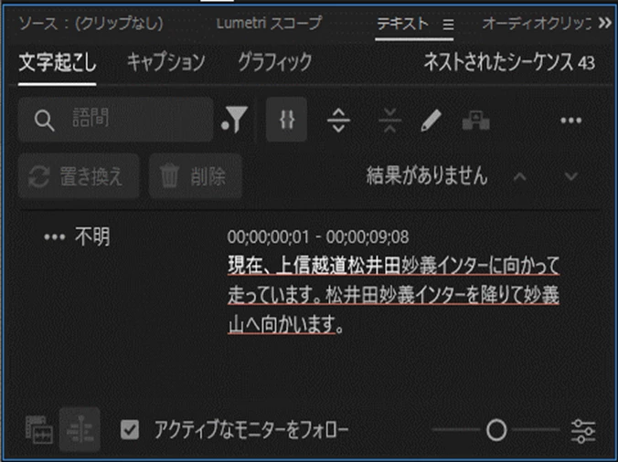 テキスト画面で文字起こしバ-が動き出し出来た!と思ったら5秒くらいで『ソースクリップを文字起こしして、シーケンスの文字起こしを表示します』とだけメッセージが出ます。ここから先をご指導のほどよろしくお願いします。