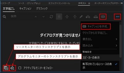文字起こしが終わって、「キャプションを作成」をするときに、「CC」アイコンがグレー、または「CCキャプションを作成」コマンドがグレーになって選択出来ない場合は、パネル左下の「ソースモニターのトランスクリプトを表示」アイコンが選択されている可能性があります。その場合は、「プログラムモニターのトランスクリプトを表示」アイコンを選択します。