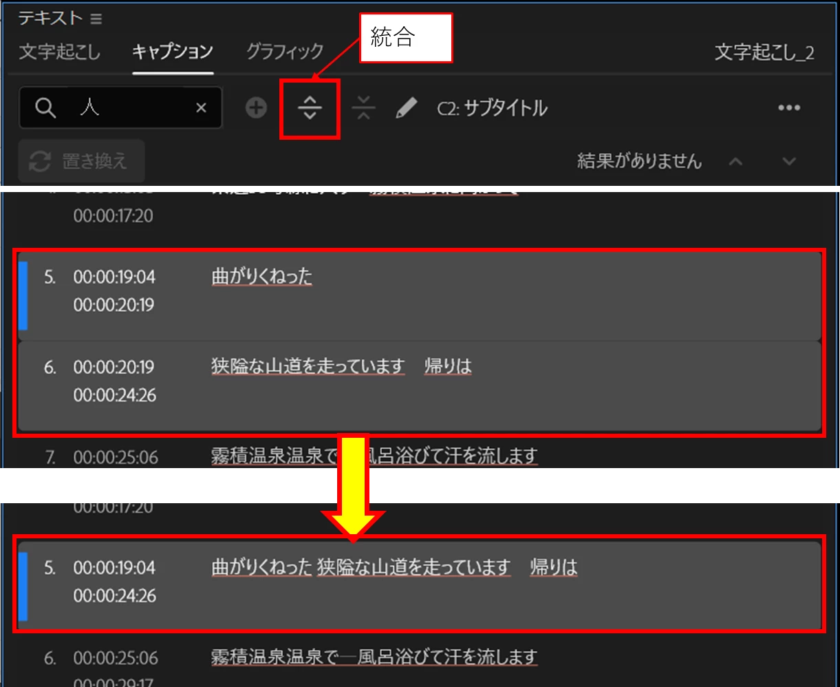 ②分割した「帰りは」と次のキャプションセグメントを統合します。