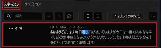 最初に「文字起こし」タブで下図のように文字起こしが出来ているでしょうか。