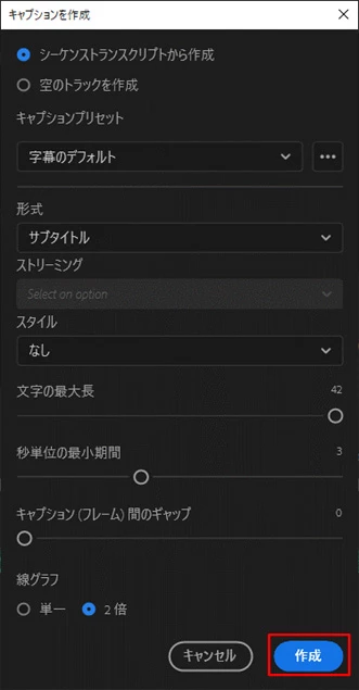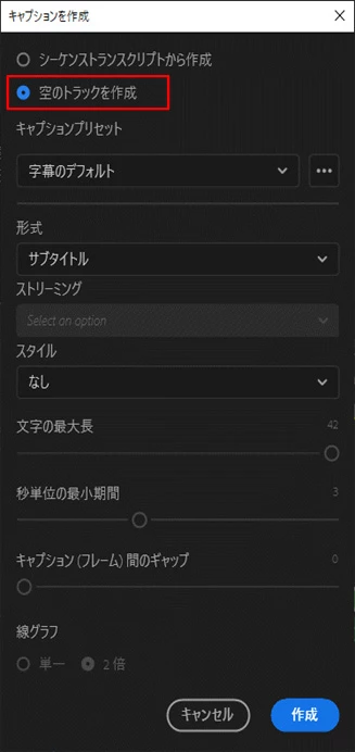 もしかしたら、「キャプションを作成」ウィンドウで「空のトラックを作成」が選択されていませんか。その場合は、「シーケンストランスクリプト」を選択してみてください。