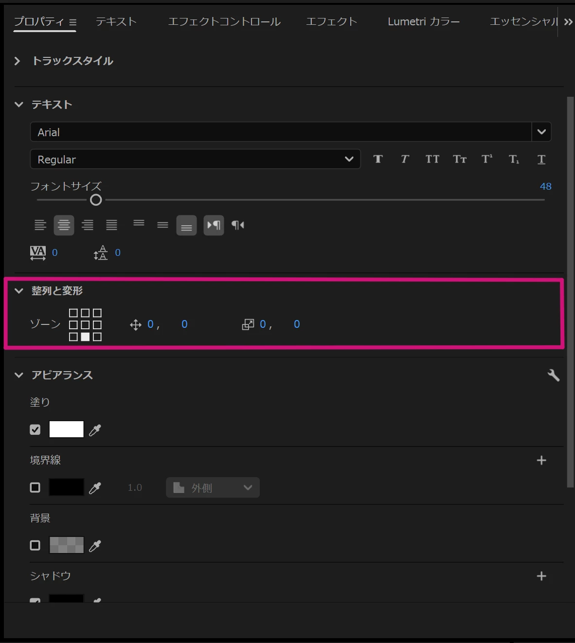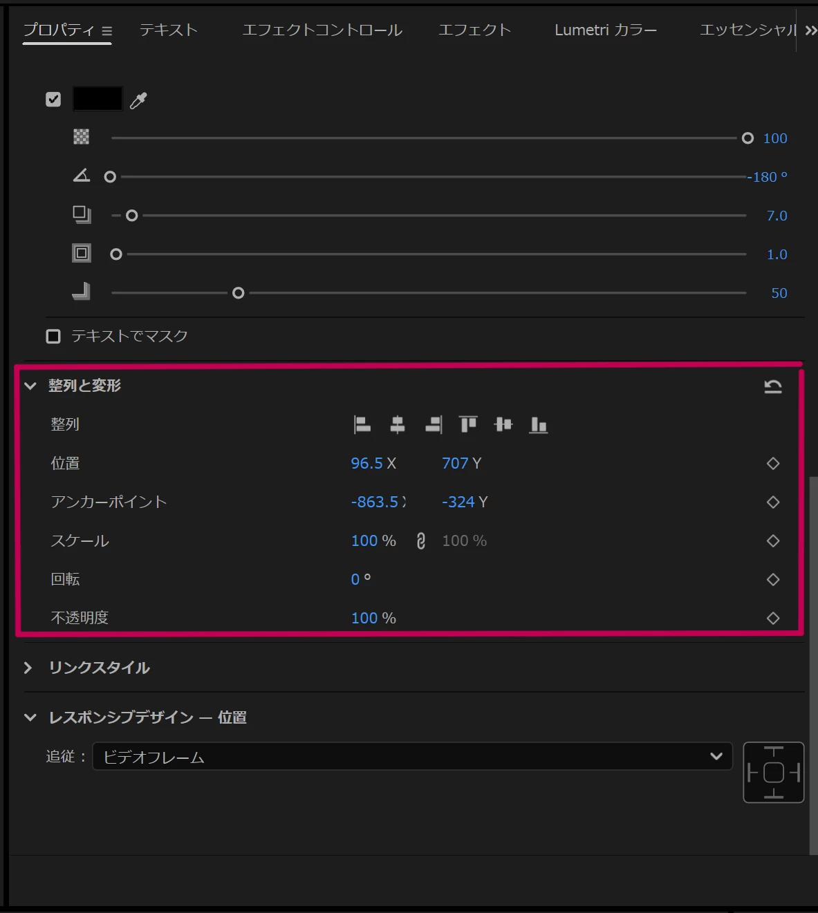 自動文字起こし、プロパティ→“整列と変形”についてご教授ください