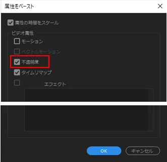 ③次に開いた「属性をペースト」ウィンドウで「不透明度」にチェックが入っていることを確認し、「OK」をクリックします。