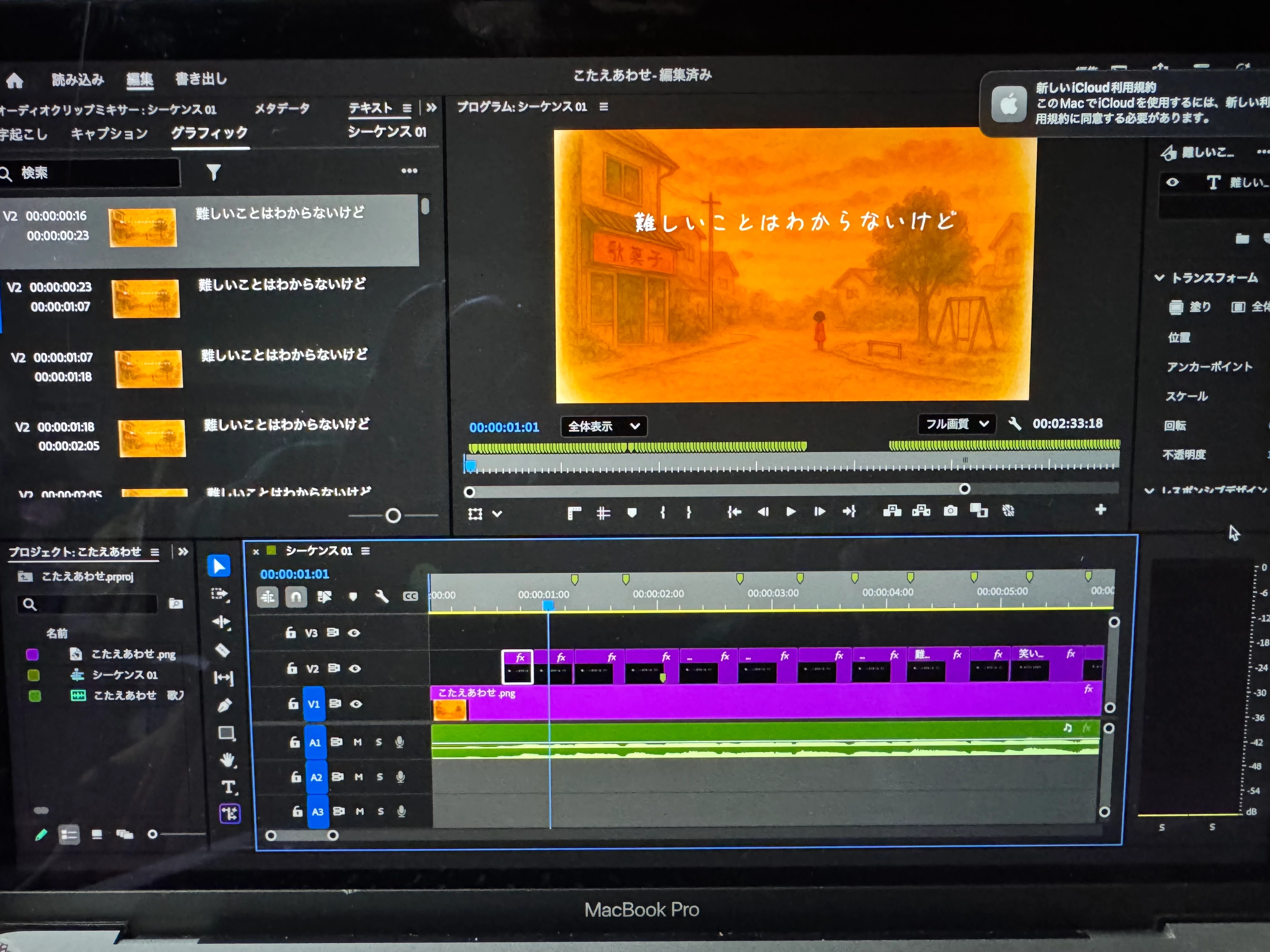 ①任意のテロップを作成し、フォント、フォントサイズ、塗り、境界線等を設定します。