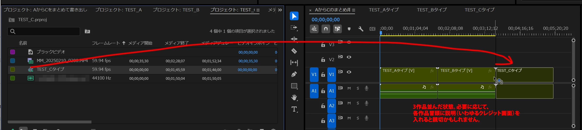 この3つのプロジェクトファイルを最終的に1つの動画としてまとめて書き出しをしたいです。