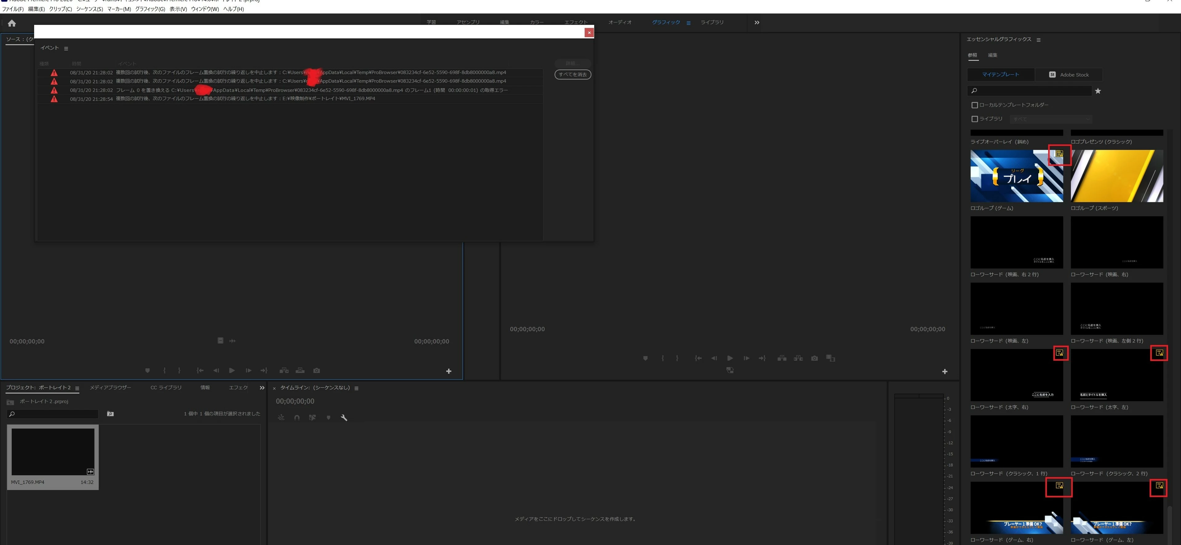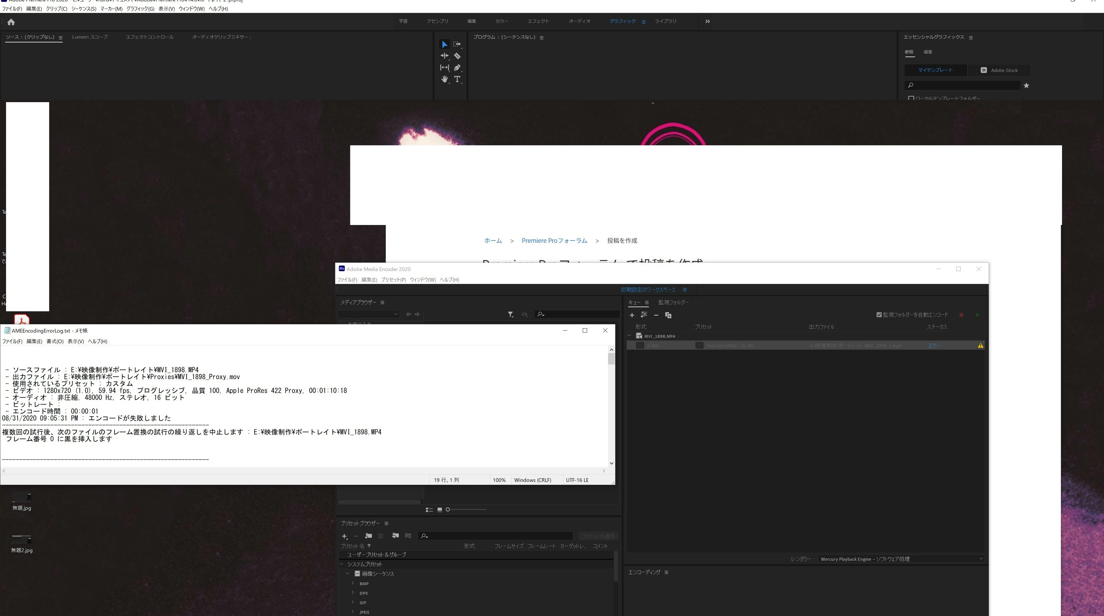 内容としては、エッセンシャルグラフィックスの一部やHD60fps動画を取り込んだ際に「フレーム0を置き換える」「複数回の施行後、次のファイルフレーム置換の試行の繰り返しを中止します」と言ったエラーメッセージが出ます。 media encoderでも同様のメッセージが出現します。4K30fpsの動画はエラーメッセージは出ません。