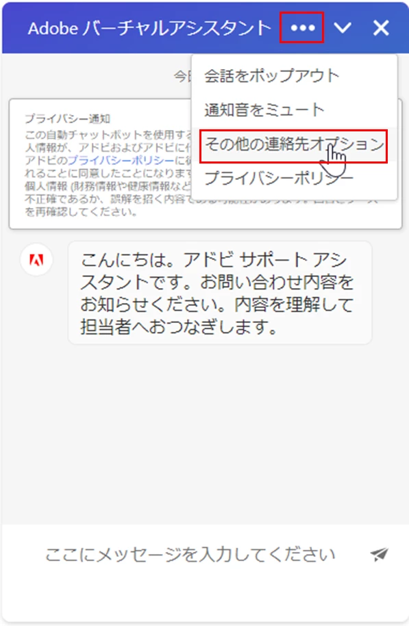 アドビサポートの問い合わせ先は、下記リンクの文書の右下の吹き出しをクリックすると、「バーチャルアシスタント」ウィンドウ(下図)が開きます。