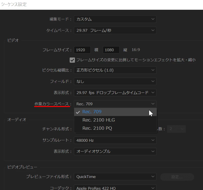 シーケンスの作業カラースペースの設定場所を書き漏らしておりました。