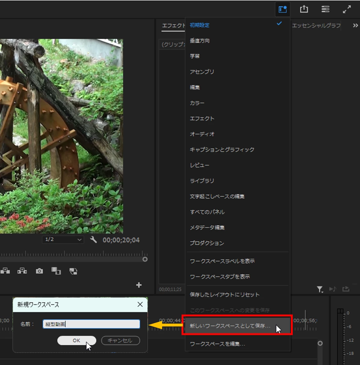 以前のバージョンで「縦長動画」という名前で入っていたワークスペースのプリセットは、「垂直方向」という名前に変更になりました。名前が変わっただけで、レイアウトは変わっていないようです。
