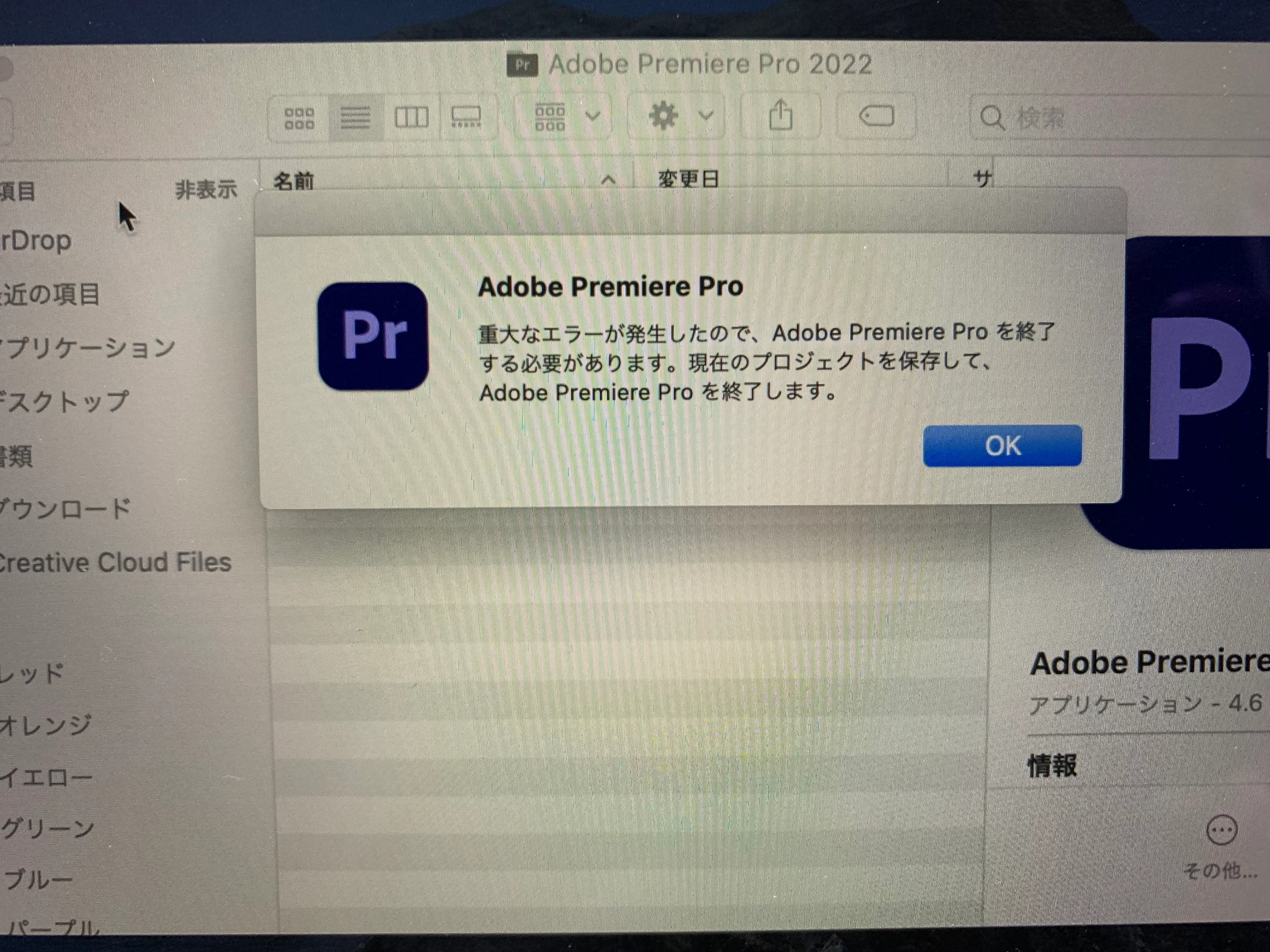 11人班Known ParticipantForum|Forum|4 years agoFebruary 1, 2022Question重大なエラー表示が頻繁に出ます。Forum|Forum|4 years agoFebruary 1, 20221 reply819 viewsプレミアプロを立ち上げようとすると以下の様なエラー表示が頻繁に出ます。原因が分からず不安です。又、プレミアを起動する事が出来なくなっております。起動しようとするとエラー表示が出てOKボタンを押して表示が消える。の繰り返しです。エラーが起こる様な負担のかかる操作はしていないのですが原因と解決方法が知りたいです。宜しくお願い致します。エラーまたは問題