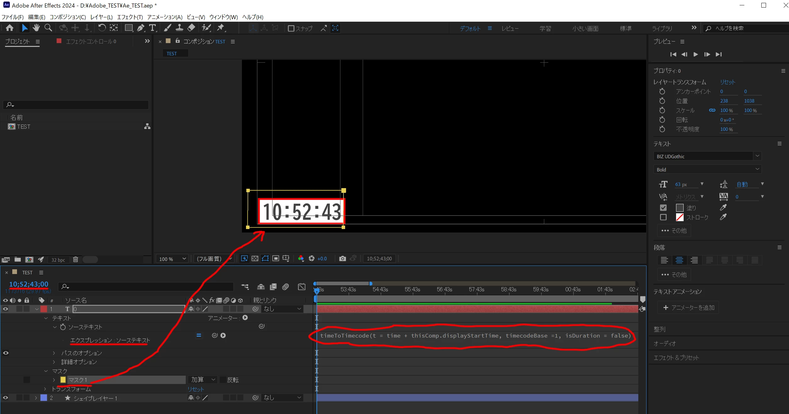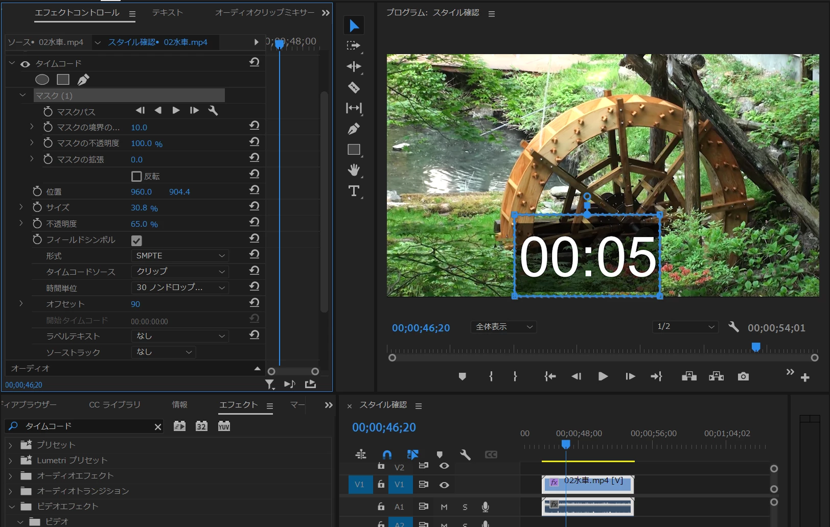 *必要な桁(時分)は「タイムコード」の「4点の長方形マスク」で切り出すのが良いです。「クロップ」エフェクトで切り出す場合は、調整レイヤーに「タイムコード」エフェクトをかけると良いです。