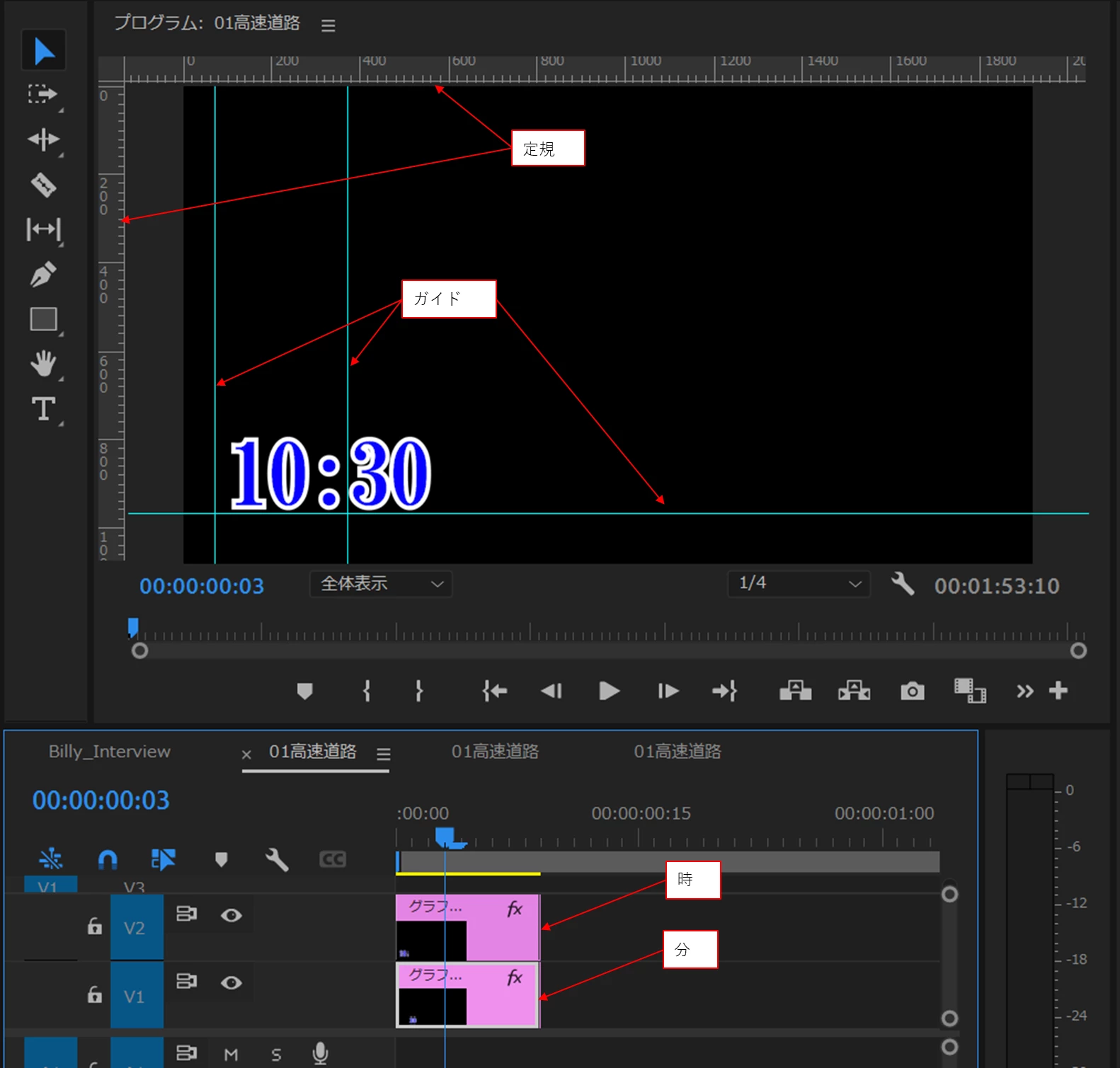 ・位置決めを容易にするため、メニューの「表示」から「定規」や「ガイド」を表示します。さらに、メニューの「シーケンス」→「タイムラインをスナップイン」を選択します。