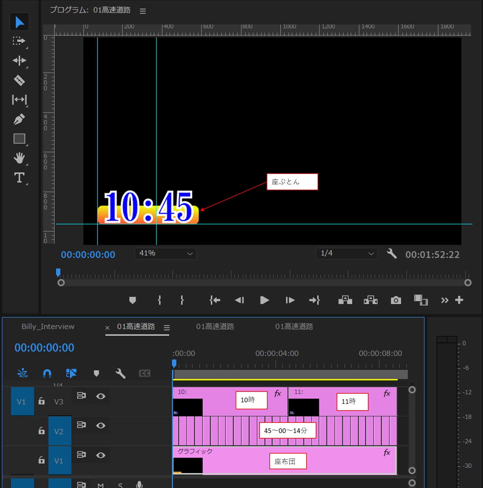 また、フリーラン(DF)でリアルタイム記録をしている素材を使う場合でも、自動的にタイムコードを読み込ませるのではなく、目視でカット頭のTCを読んでその時分秒を開始点として時計表示を作りました。