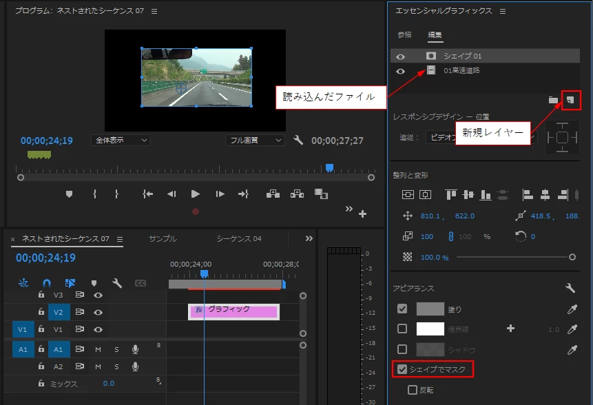 ③「シェイプ 01」レイヤーを選択し、「アビランス」項の「シェイプでマスク」にチェックを入れます。