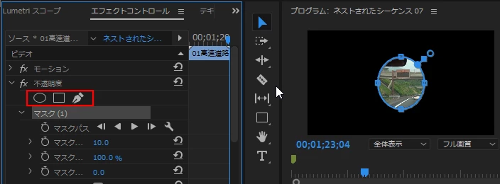 ②「エフェクトコントロール」パネルを開き、「不透明度」項にある「楕円形」「長方形」「ペン」アイコンのいずれかをクリックするとマスクがかかります。