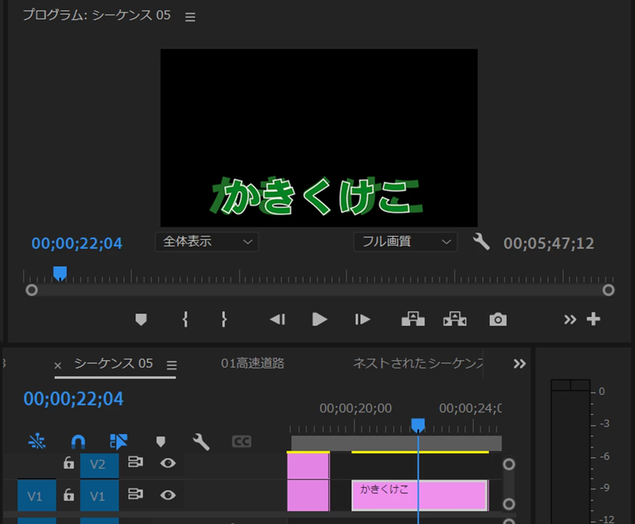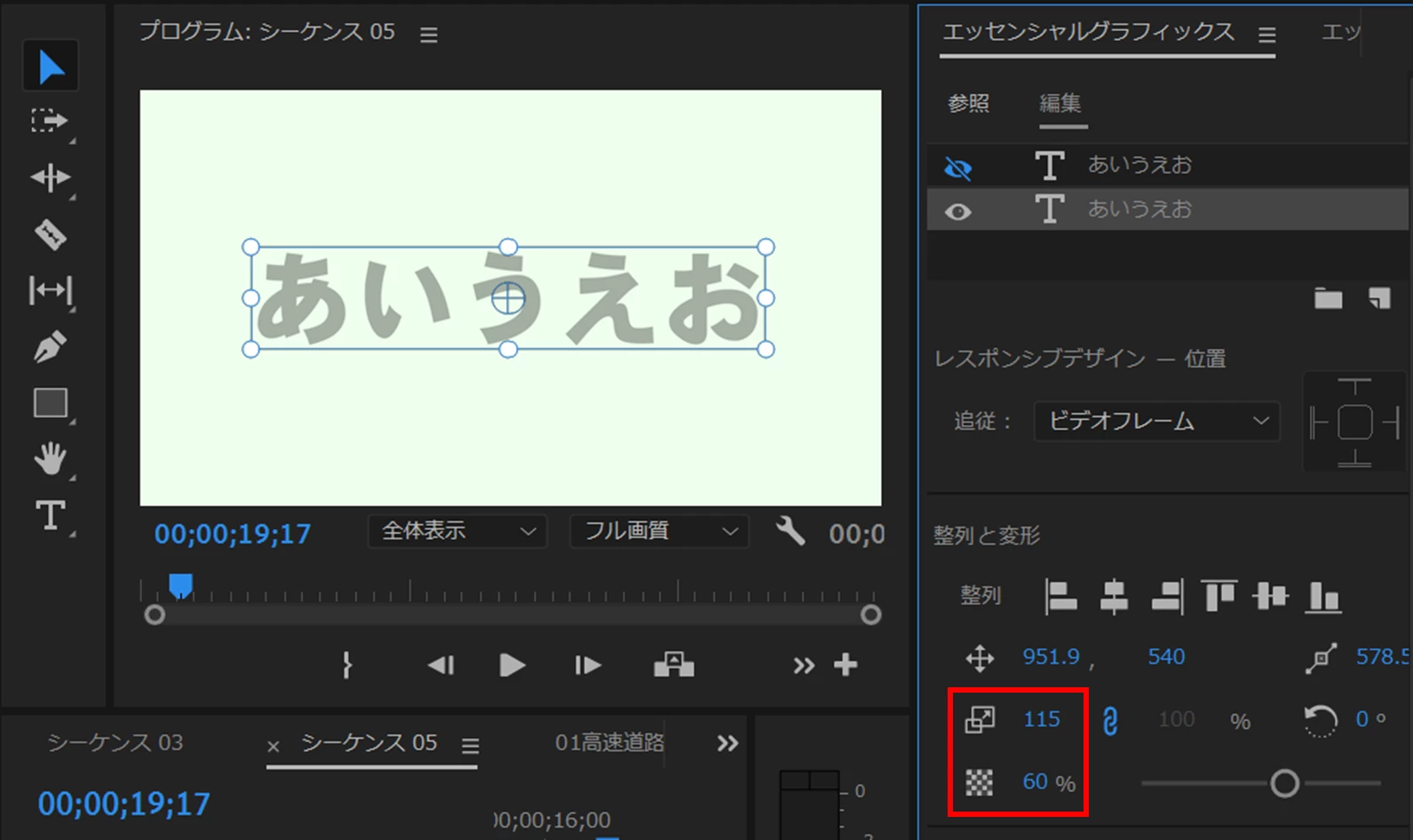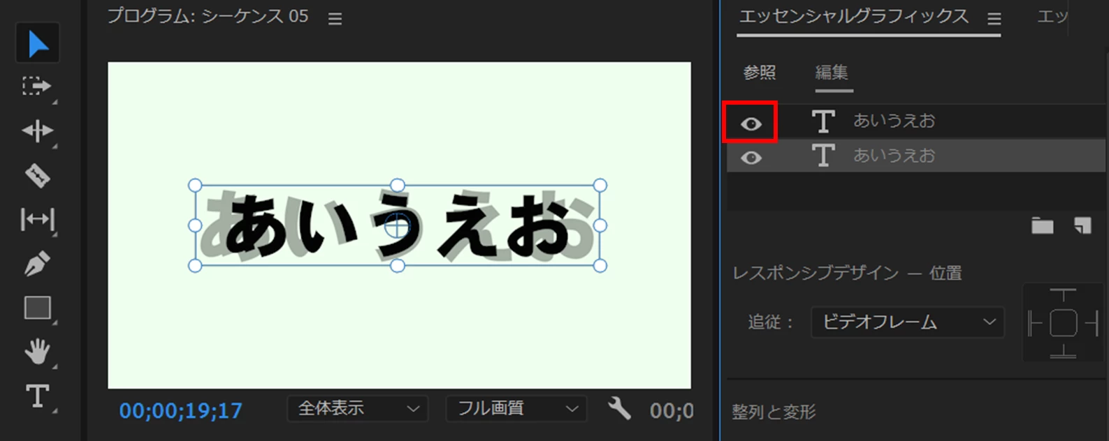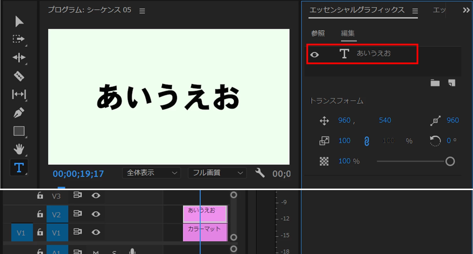 ⑤ビデオトラックへ配置したモーショングラフィックステンプレートクリップは他のグラフィッククリップと同様に編集できます。ここでは色を変えたり境界線を追加し、位置を移動してみました。