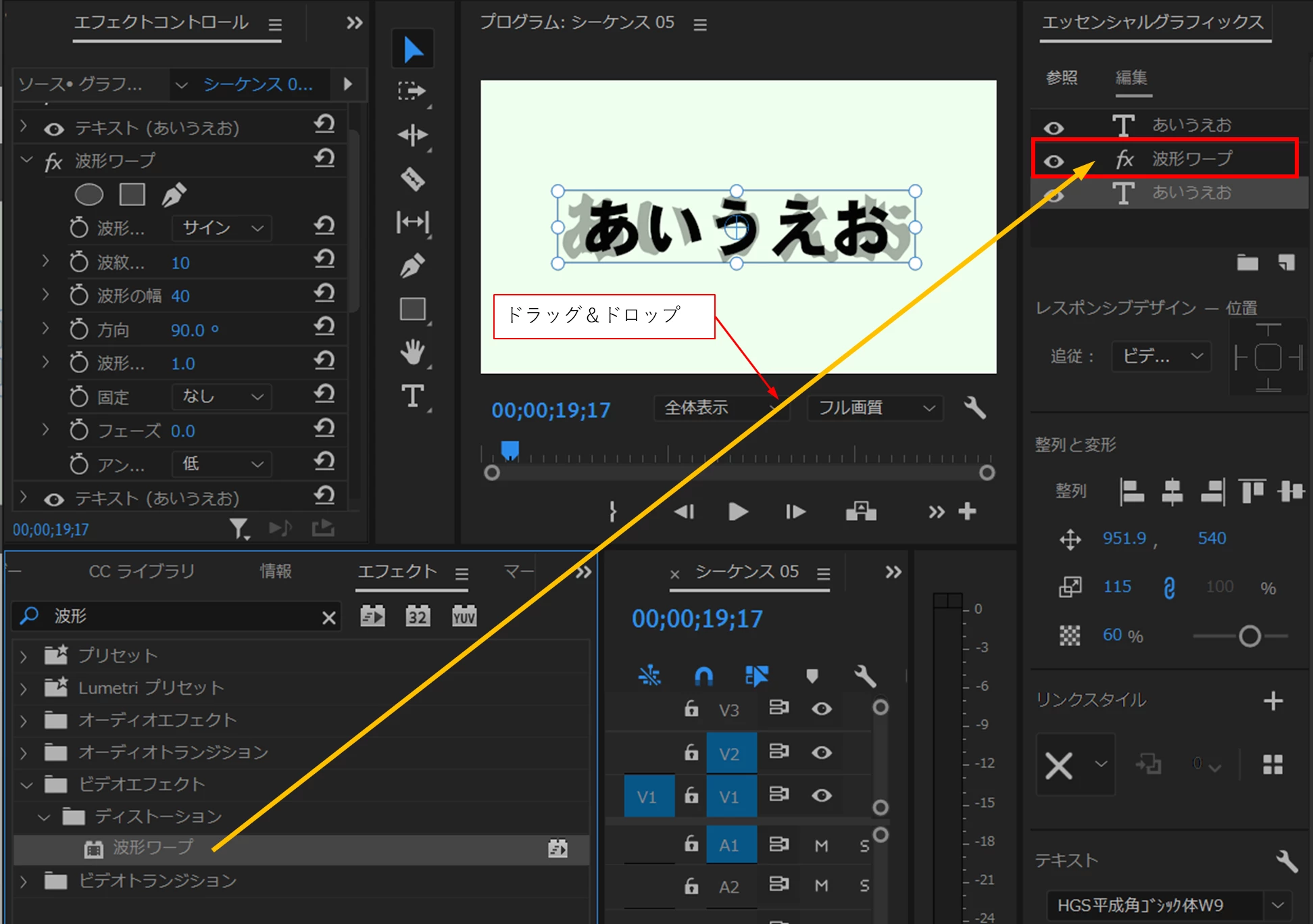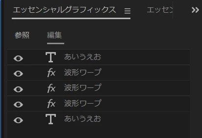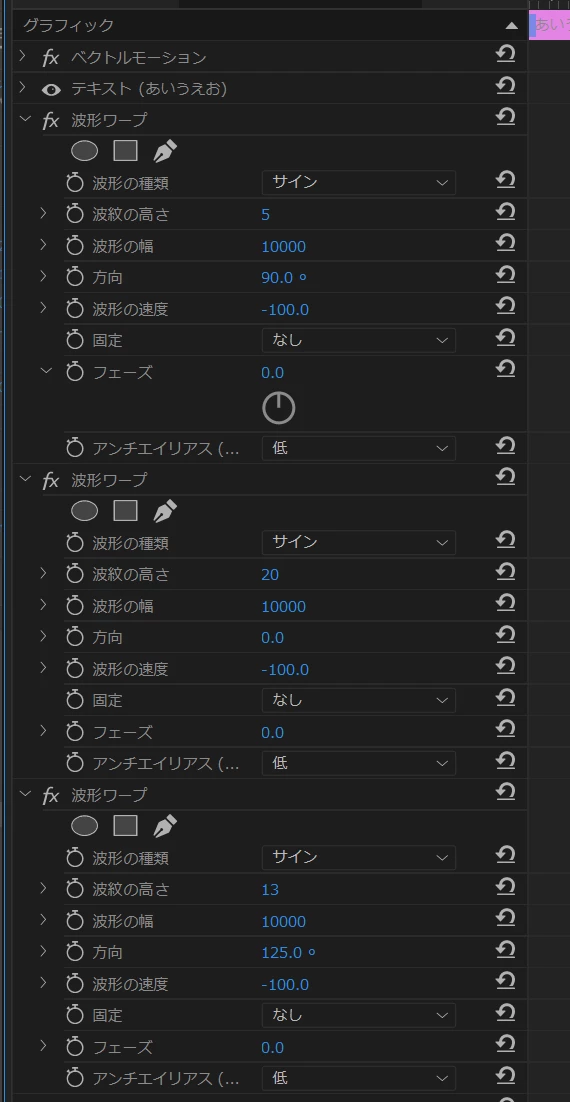 最初の作成方法のほうでは、エディステさんのYouTube動画に「エフェクトプリセット」で保存する方法の説明があります。これは2番目の作成方法では「波形ワープ」エフェクトを3個使用しているため使用できません。
