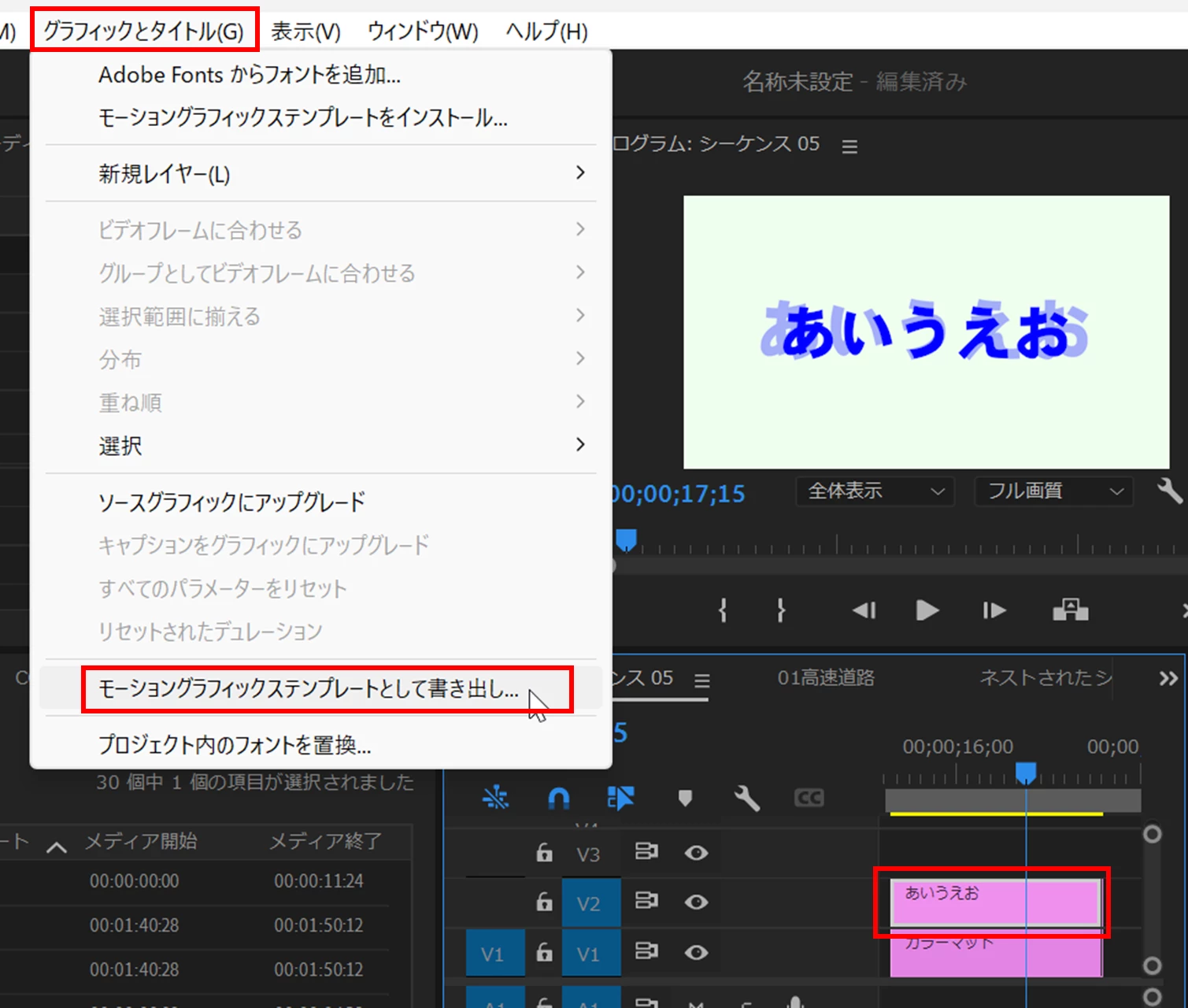 ②ビデオトラックでグラフィッククリップを選択し、メニューの「グラフィックとタイトル」→「モーショングラフィックステンプレートとして書き出し」を選択します。
