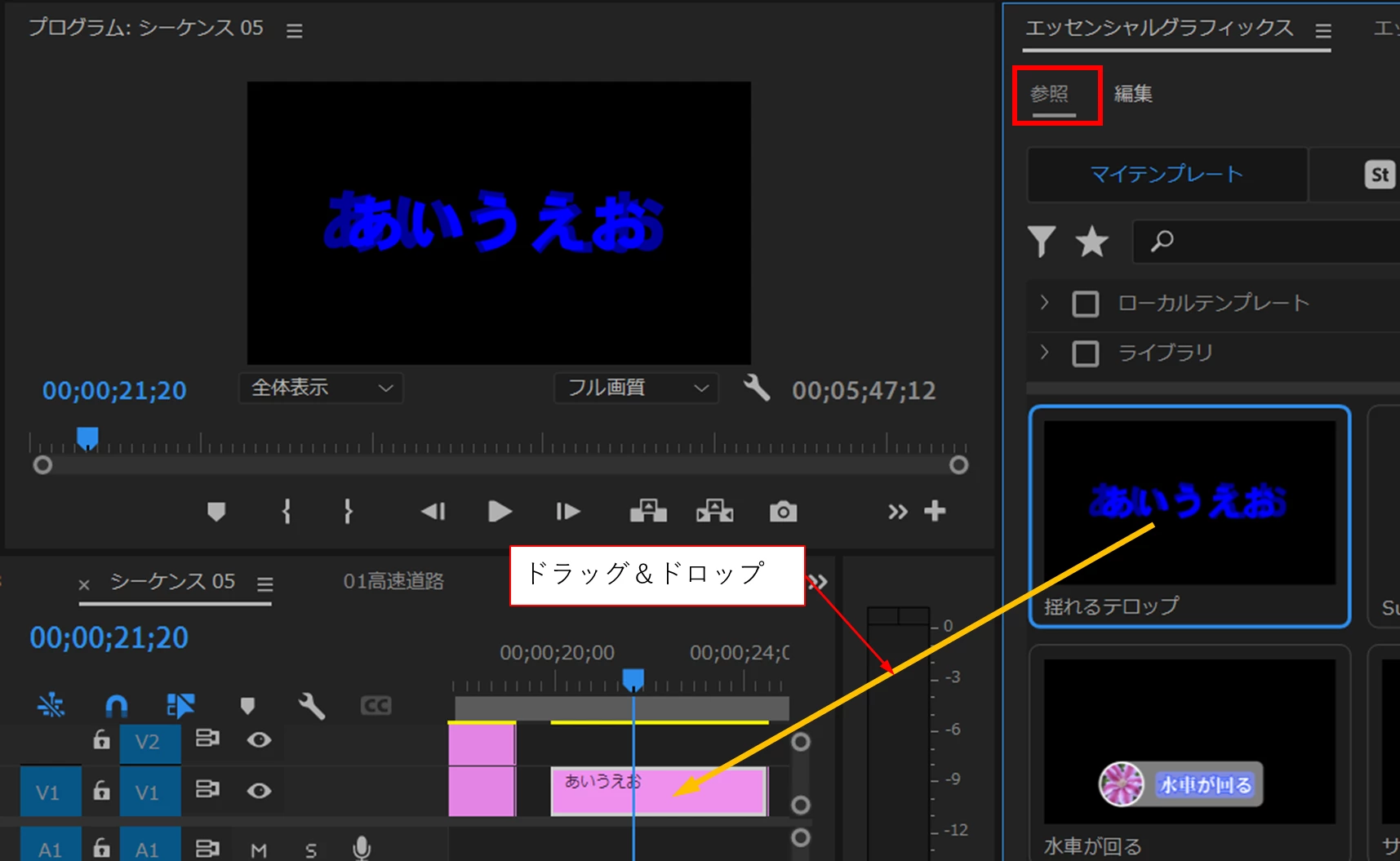 ④「エッセンシャルグラフィックス」パネルの「参照」タブを開くと、モーショングラフィックステンプレートとしてが登録されています。