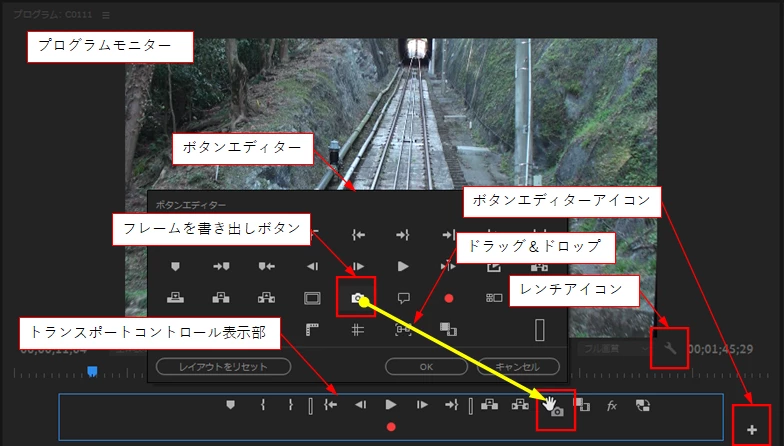 キャプチャボタン(カメラマークのやつ)およびその他いろいろなツールボタンがソースパネルにあって、