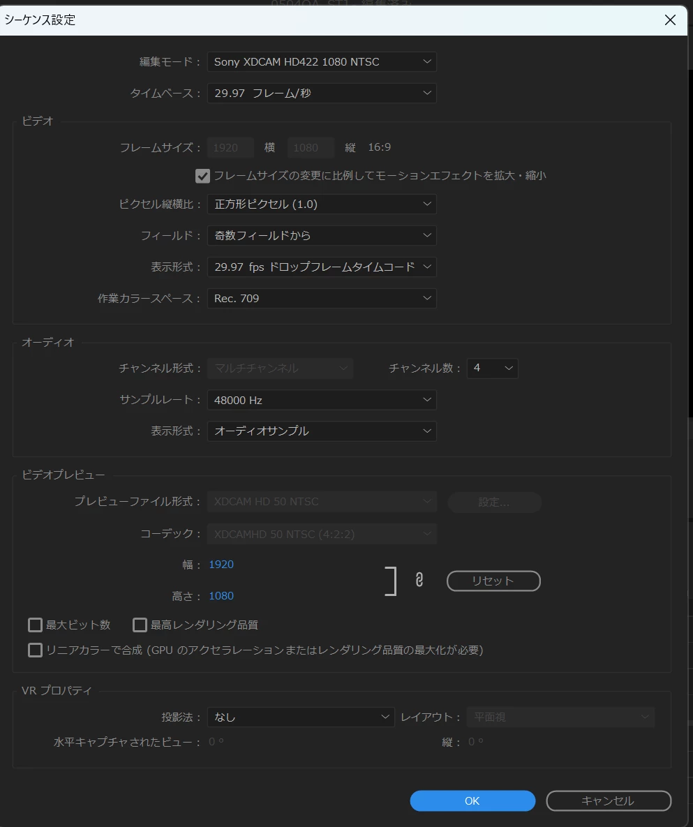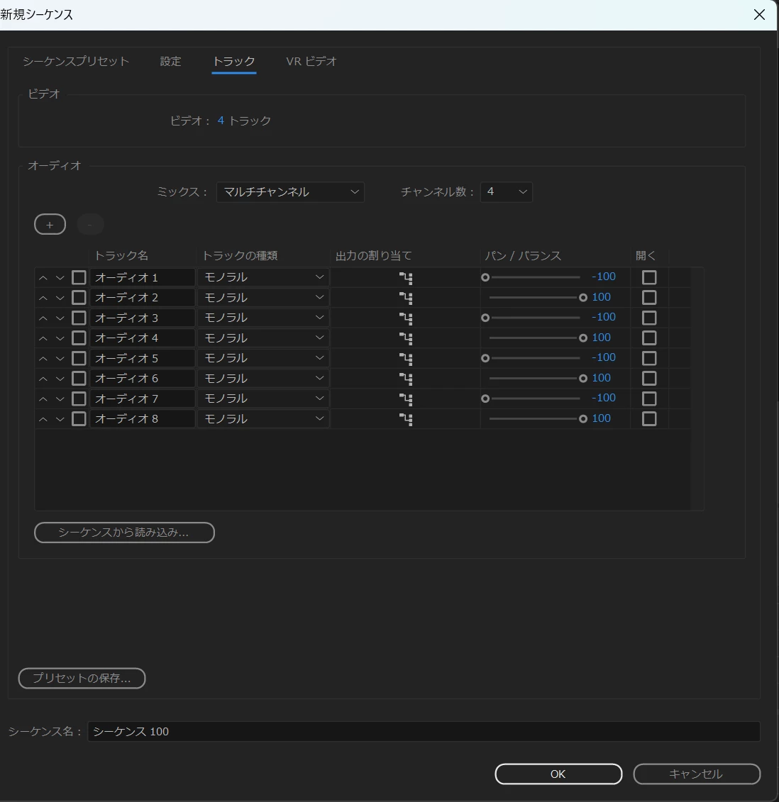 添付していただいた1枚目の画像からは、4チャンネルのマルチチャンネルになっていることが確認でき、2枚目の「新規シーケンス」の設定画面の通り作成なさったと仮定しますと全てモノラルトラックになっているかと思いますので、素材の方がステレオになっている状況かと思います。