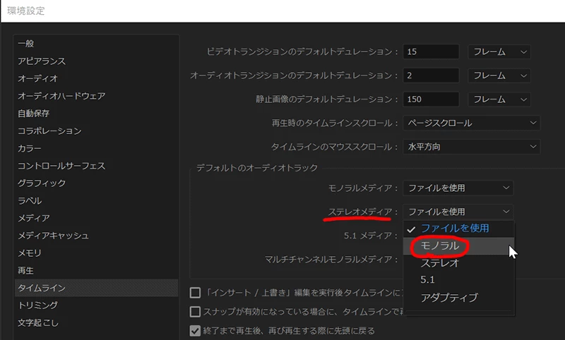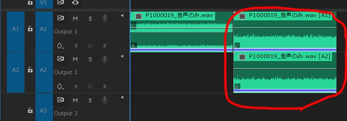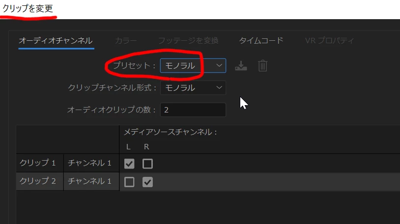 環境設定で素材読み込み時の挙動を変えてすべてモノラルで読むように設定もできますが、ひとまず問題が起きている素材をプログラムパネルで右クリックし、「変更」-「オーディオチャンネル」でプリセットを「モノラル」にしてから、改めてシーケンスに貼り付けていただくといかがでしょうか。