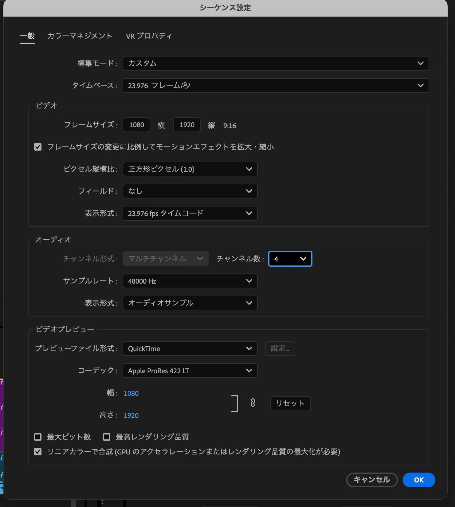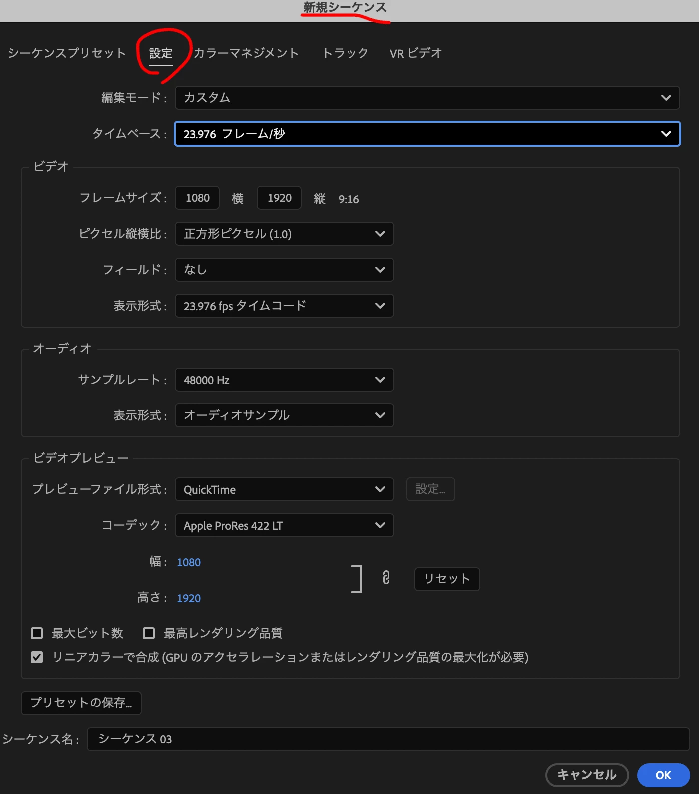 現在のシーケンスの設定をお教えいただけましたら、適切なシーケンスプリセットをご案内しやすくなります。