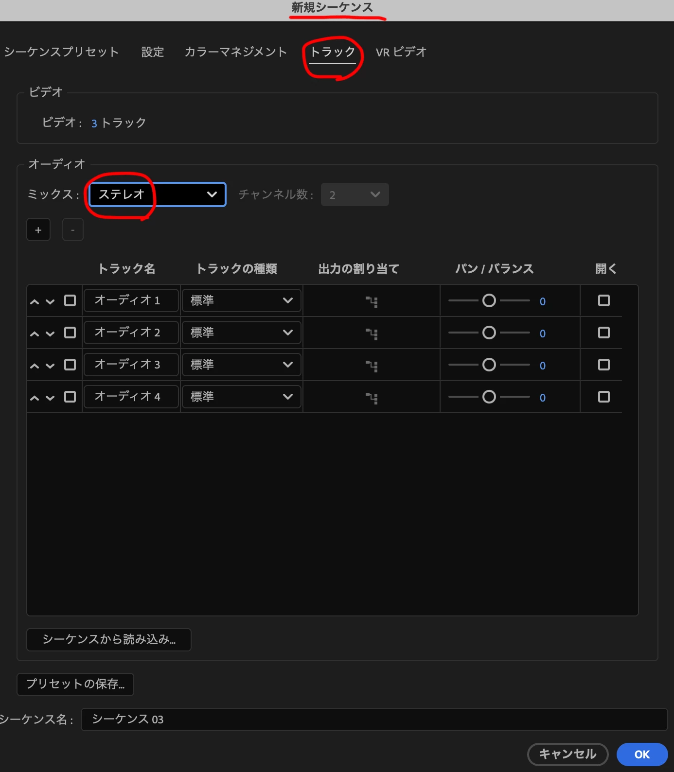 添付して頂いた画像のオーディオメーターの部分から、シーケンス設定がマルチチャンネル(4チャンネル)になっているようです。