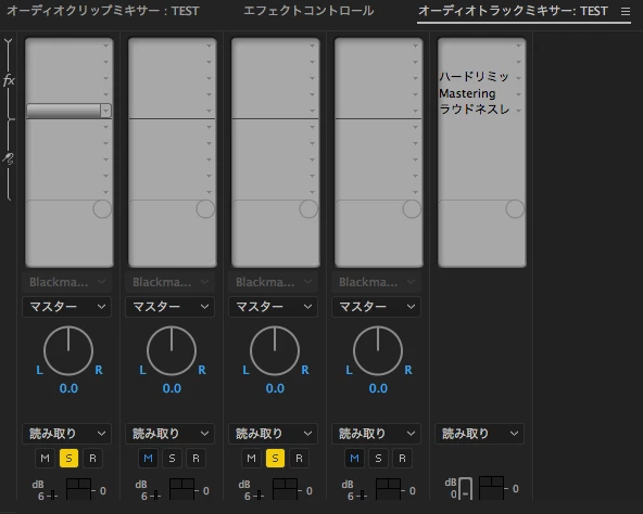 トラックミキサーのパンとフェーダーを確認してみてください。