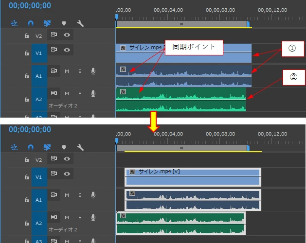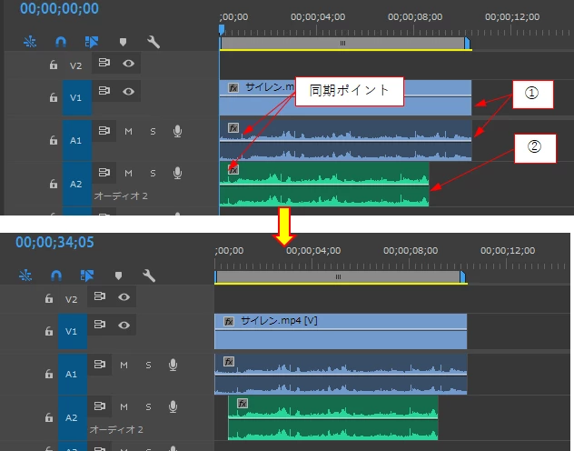 タイムライン上で①、②の同期を行うと、①のクリップが移動してしまう。