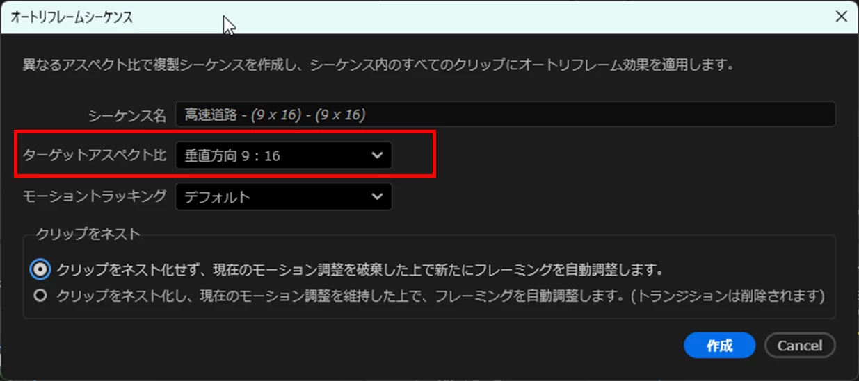 ③「オートリフレームシーケンス」ウィンドウで、「ターゲットアスペクト比」で対象のアスペクト比を選びます。ここでは「垂直方向9:16」を選択しました。