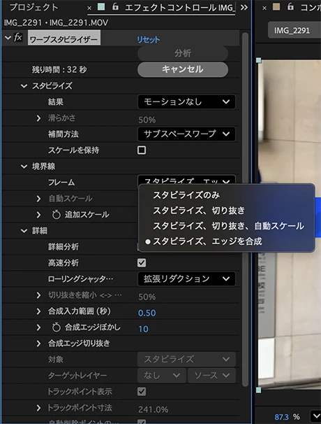 設定のフレーム(エッジを合成)を選択すると指定時間内の別のフレームから不足している周辺の画像を合成させる方法になります。