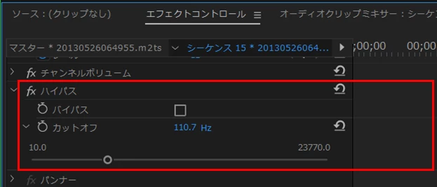 ②オーディオクリップを選択したまま、「エフェクトコントロール」パネルを開きます。