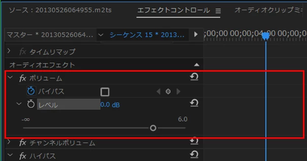 ②「エフェクトコントロール」パネルを開き、「ボリューム」項の「レベル」の「数値」または「スライダー」で音量を調整します。初期値は0.0dBです。