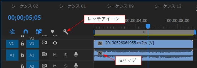①オーディオクリップの左上に「fxバッジ」があるか確認し、ない場合は「レンチアイコン」をクリックして開いたメニューから「fxバッジを表示」を選択します。すると、「fxバッジ」がクリップに表示されます。