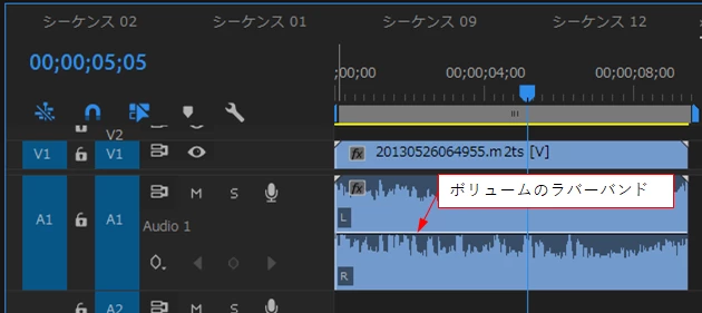 ③オーディオクリップにボリュームのラバーバンドが表示されます。トラックの幅が狭いと良く見えませんので、広げると見えるようになり、また作業しやすくなります。
