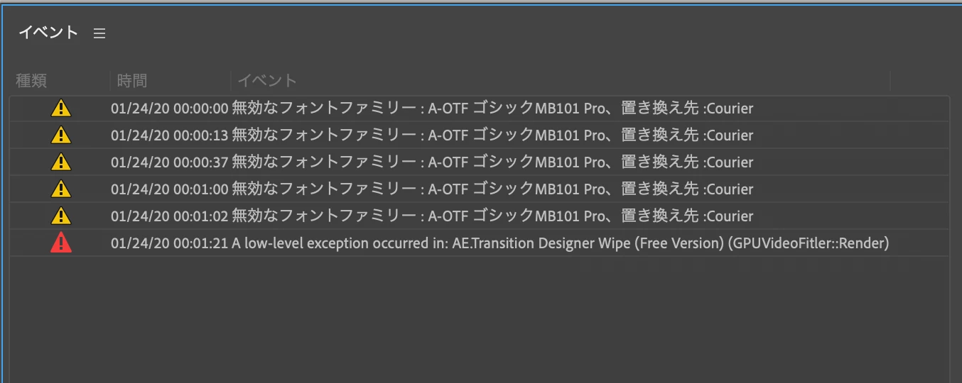 画面右下に赤い三角が出現して、添付画像のようなエラーメッセージが出現します。