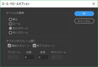 ②タイトラーの「ロール・クロールオプション」ボタンをクリックし、開いた「ロール・クロールオプション」ウィンドウで「左へクロール」の設定を行います。