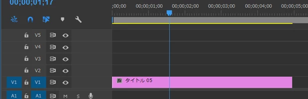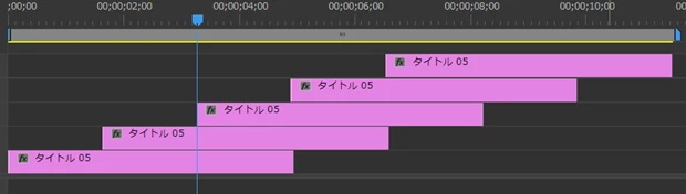 ④同じクロールタイトルクリップを異なるビデオトラックに文字列の繋がりが丁度良くなるように配置します。ここでは5個配置しました。