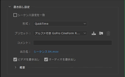 ⑤クロールタイトルクリップが5個あるシーケンスを、透明を維持出来るファイル形式でファイルに書き出します。