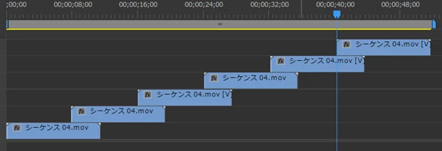⑥書き出したファイルを読み込み、新しく作成したシーケンスの異なるビデオトラックに文字列の繋がりが丁度良くなるように配置します。 ここではクロールタイトルを30回ループさせるので6個配置しました。