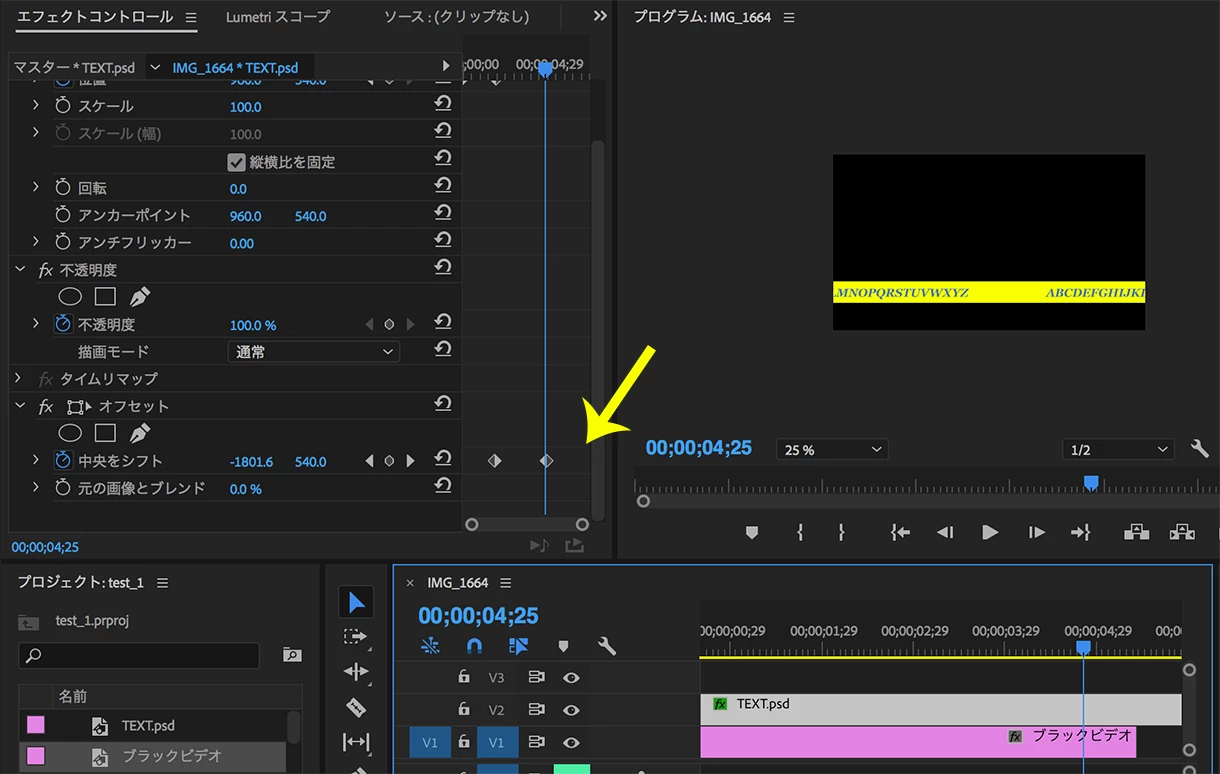 エフェクトの「オフセット/中央をシフト」で、テキストを延々とスクロールできます。