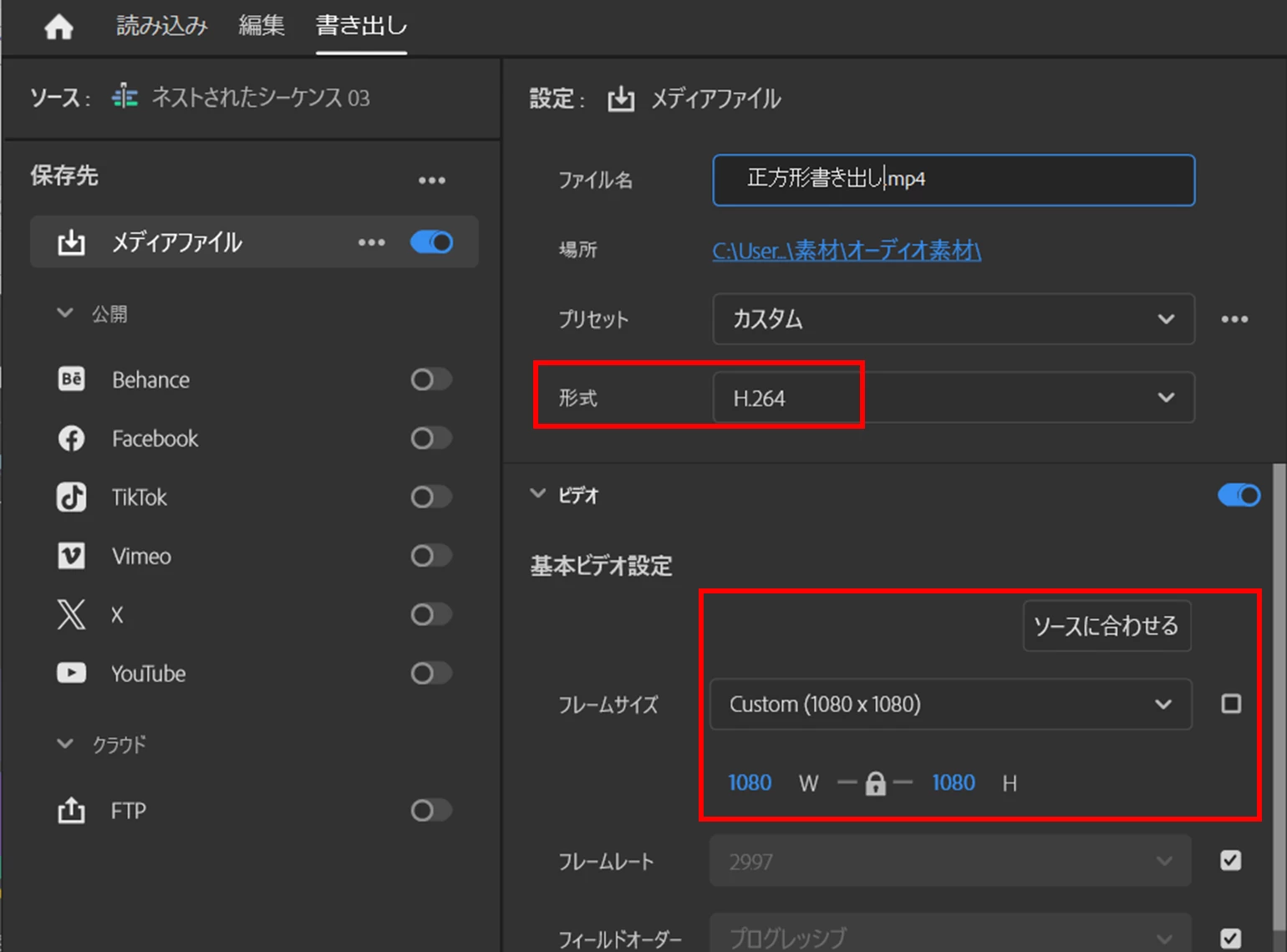 書き出しを実行しなくても、「予測ファイルサイズ」におおよそのサイズが表示されます。