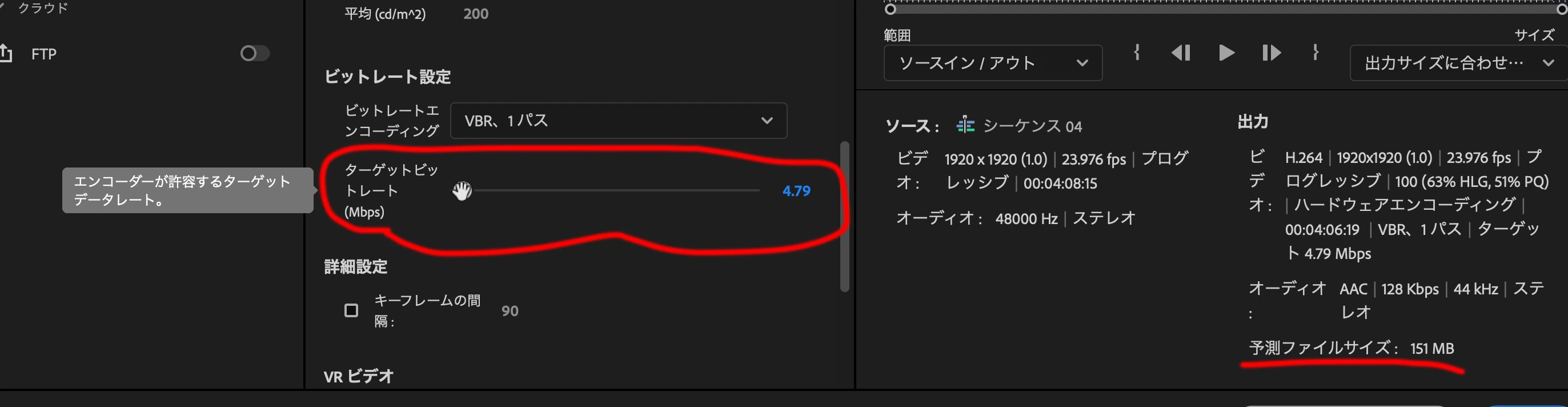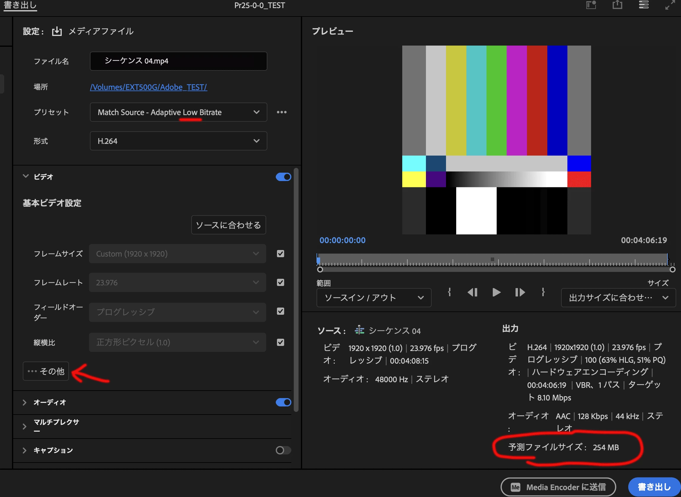 今回、原因の切り分けのため「Match Source - Adaptive High Bitrate」というプリセットをご紹介しましたが、「High Bitrate」とある通りビットレートが高い(=ファイルサイズが大きい)設定のものです。