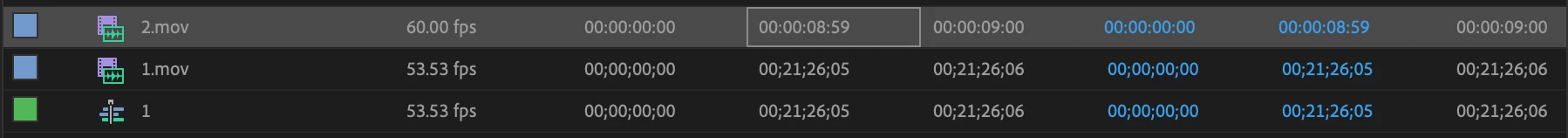 本題とはそれてしまうのですが、添付画像では作成されたシーケンスのフレームレートが53.35fpsとなっていますが、使用目的によっては適切ではなかったり編集しにくかったりするかと思いますので、最終的な使用目的を見据えて設定なさるとよいと思います。