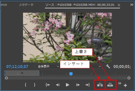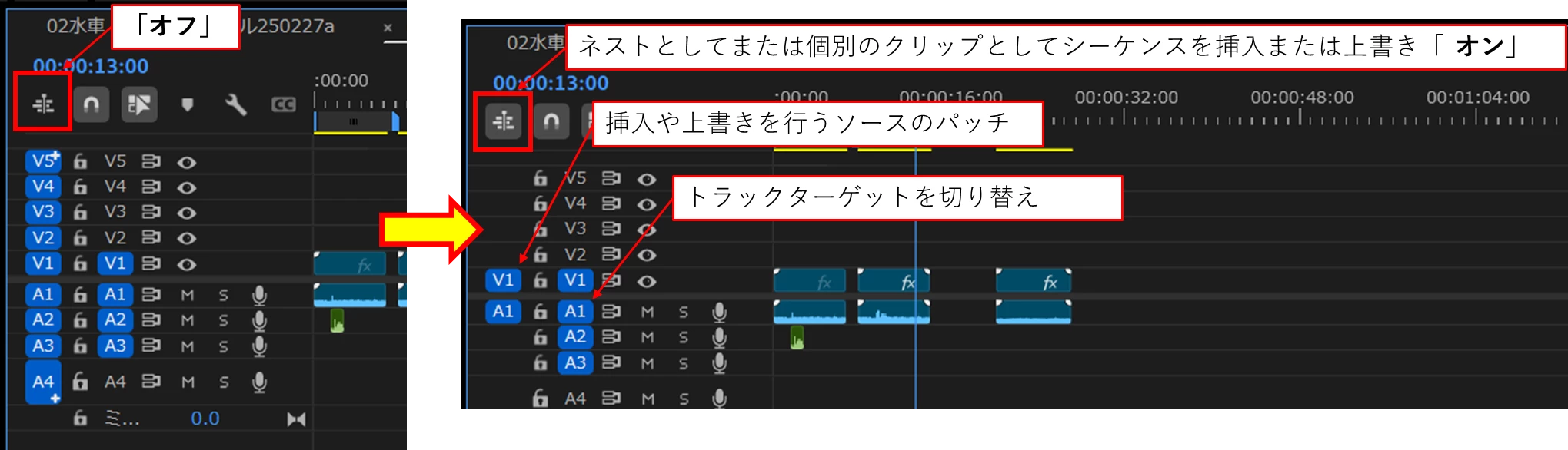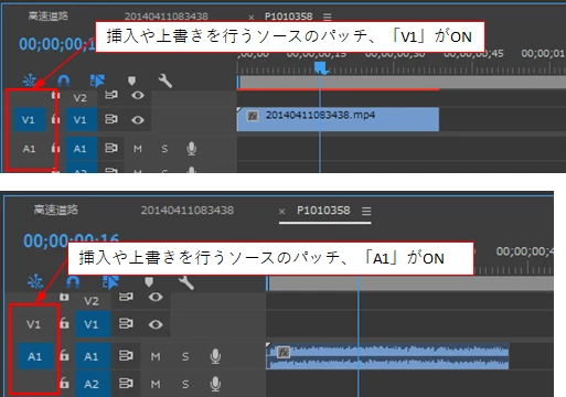 アセットを「ソース」パネルから「タイムライン」パネルへ「インサート」や「上書き」を行う場合、「挿入や上書きを行うソースのパッチ」アイコンでトラックを指定します。
